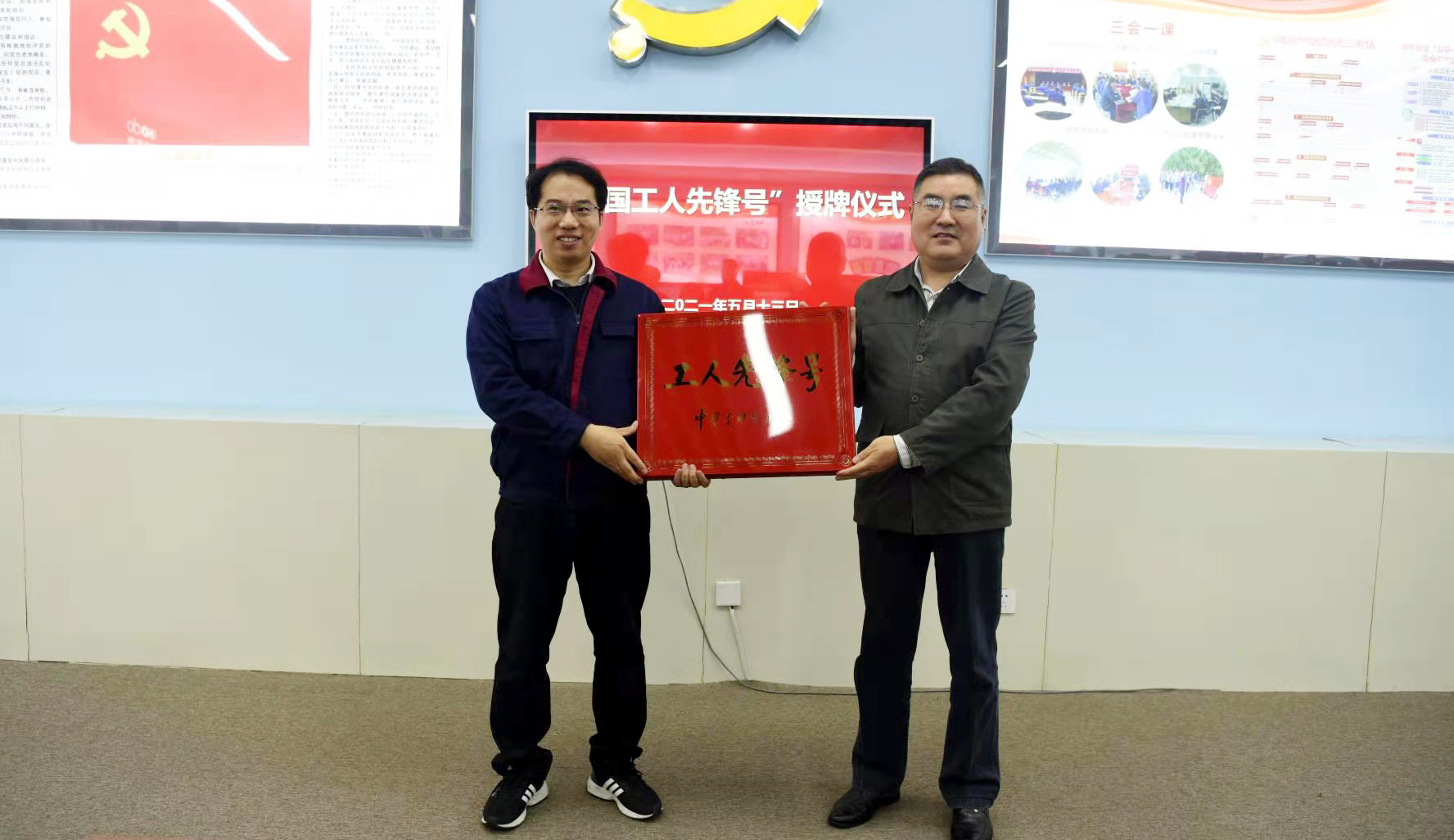 5月13日,市总工会副主席陈健到氨纶公司,为差别化氨纶研发项目组授予“全国工人先锋号”奖牌。华体会(中国)公司工会主席刘承志,市总工会劳动和经济工作部部长许小兵等参加授牌仪式。