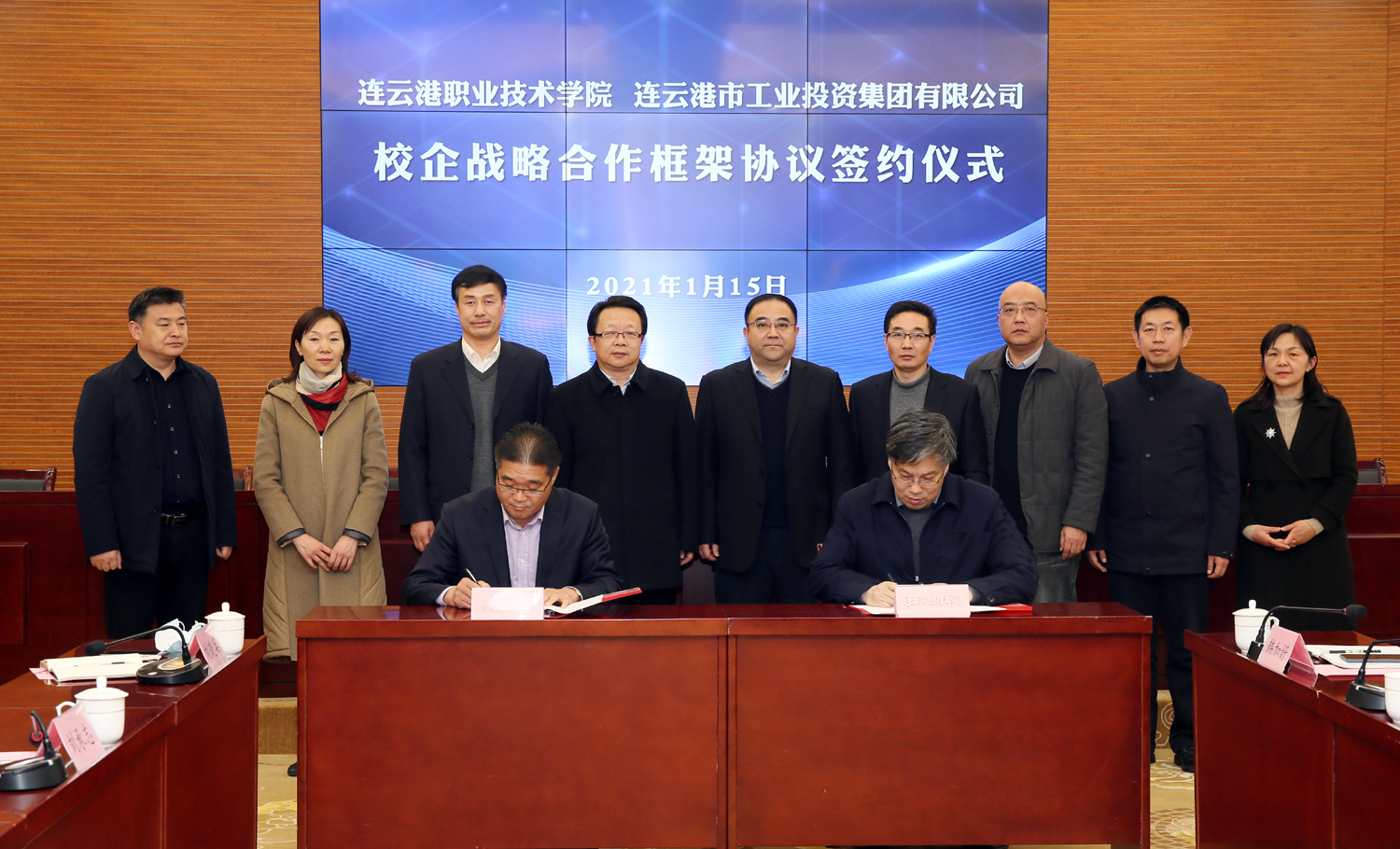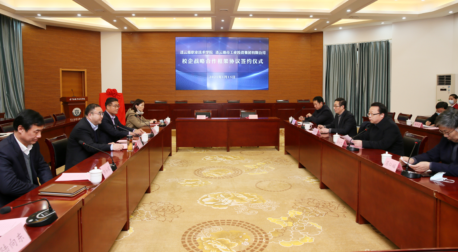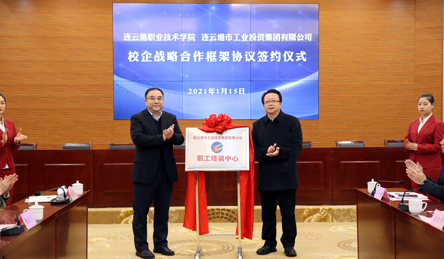 为深入推进产业工人队伍建设改革,搭建职工教育培训平台,1月15日,在连云港职业技术学院举行校企合作签约仪式,并为华体会(中国)公司职工培训中心揭牌。华体会(中国)公司党委书记、董事长杨龙,工会主席刘承志,总经济师陈如军;连云港职业技术学院党委副书记、校长骆汝九,副校长葛仁福、汪建明等领导出席活动。 骆汝九致欢迎辞,表示通过合作办学、合作育人、合作发展,构建优势互补、资源共享、互惠双赢、共同发展的新格局,推动高等职业教育与经济社会同步发展,全面开启校企战略合作的美好未来。
