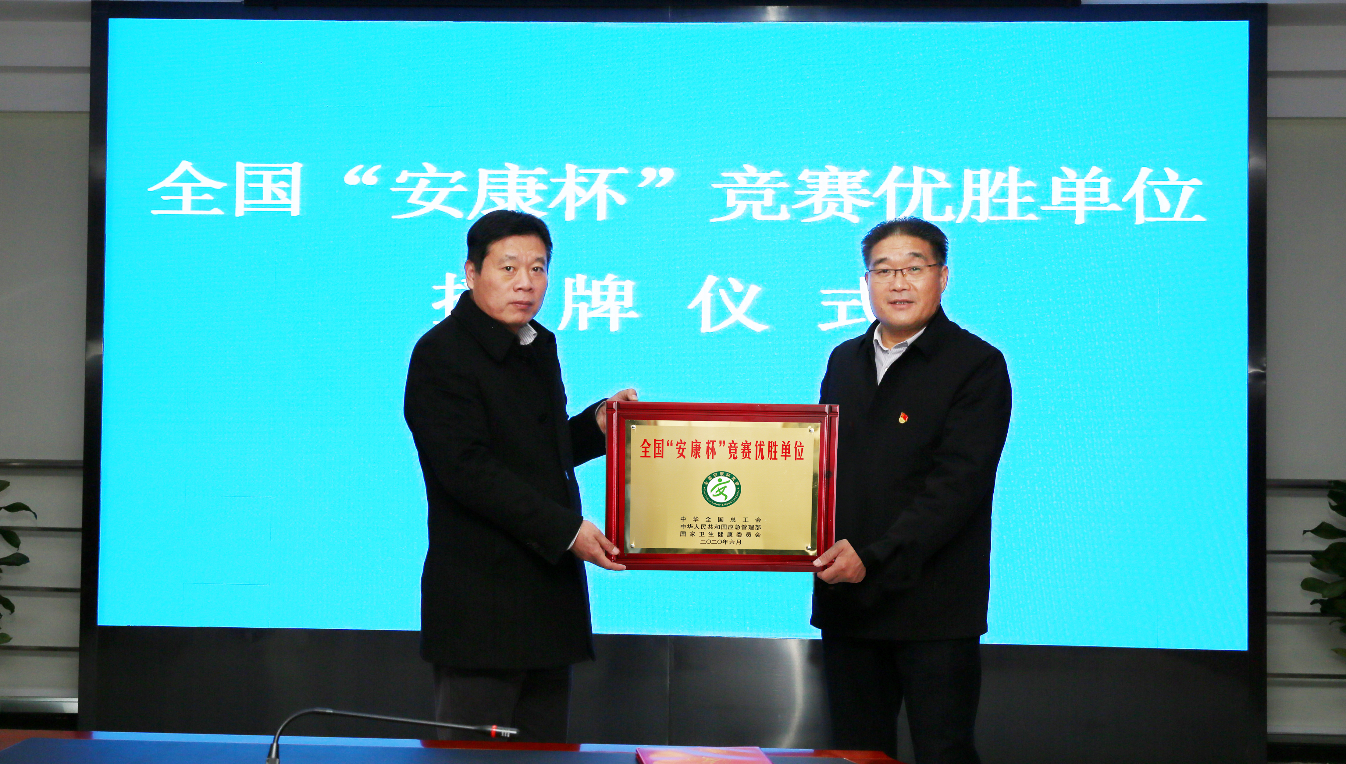 12月17日,市总工会党组书记、副主席丁维杰向华体会(中国)公司授予全国“安康杯”竞赛优胜单位奖牌。华体会(中国)公司党委书记、董事长杨龙,党委副书记戴鸿鸣、工会主席刘承志参加授牌仪式。