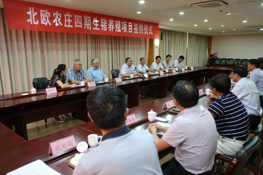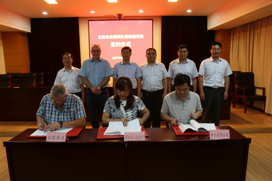 8月7日下午,北欧农庄四期生猪养殖项目签约仪式在灌云县行政中心举行。华体会(中国)公司领导杨龙、胡建明、陈如军,灌云县领导朱兴波、王庆嘉、张凌云,丹育公司董事劳伦斯·桑德高,连云港北欧农庄生猪养殖有限公司首席执行官杨林柏等出席签约仪式。
