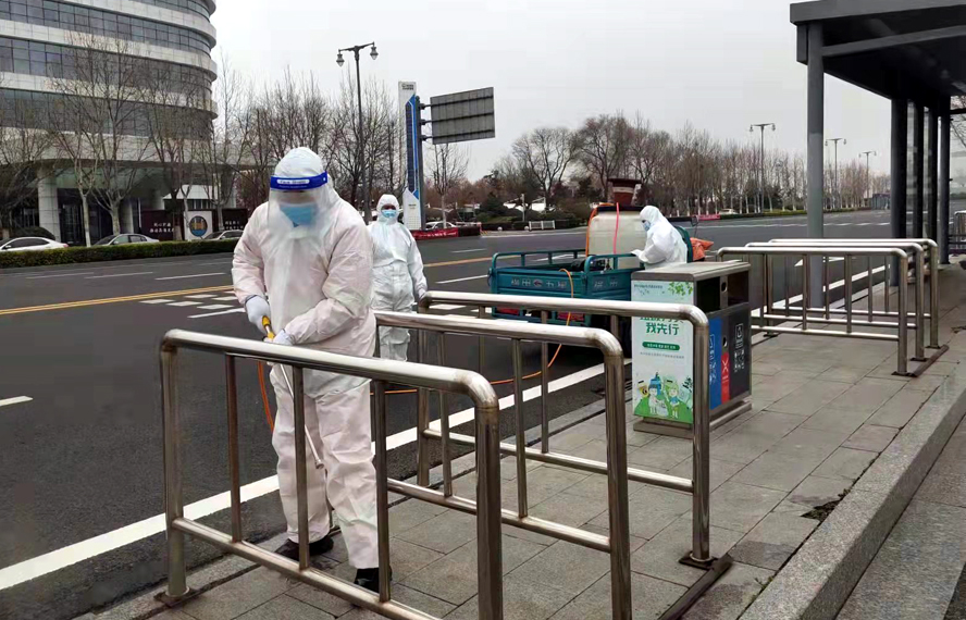 清洁消杀环环相扣。316日上午11时,悦升总部门前水雾弥漫,多台作业归来的车辆正有序地进行着消杀清理。据公司徐总介绍,自疫情发生以来,公司积极配合新区疫情防控部署,全方位构筑防疫联控网络。每天7点公司的消杀车就开始对徐圩新区、邻里中心、居民小区等65万平方米的辖区进行大规模的消杀作业。公司在做好辖区正常的人工保洁工作同时,每天出动大型作业车辆4个台班,清扫路面长达6个小时,垃圾清运班每日清运各类垃圾达10余吨。下午3点半,狂风伴着寒流,市劳模龚飞正带领班组成员对徐圩核心区域内的公交站台、果皮箱进行全面清洁消杀,清掏、装袋、搬运、消毒,不断重复的操作流程既繁琐又劳累,寒风中,他们的防护服早已湿透,但却无人顾及。
