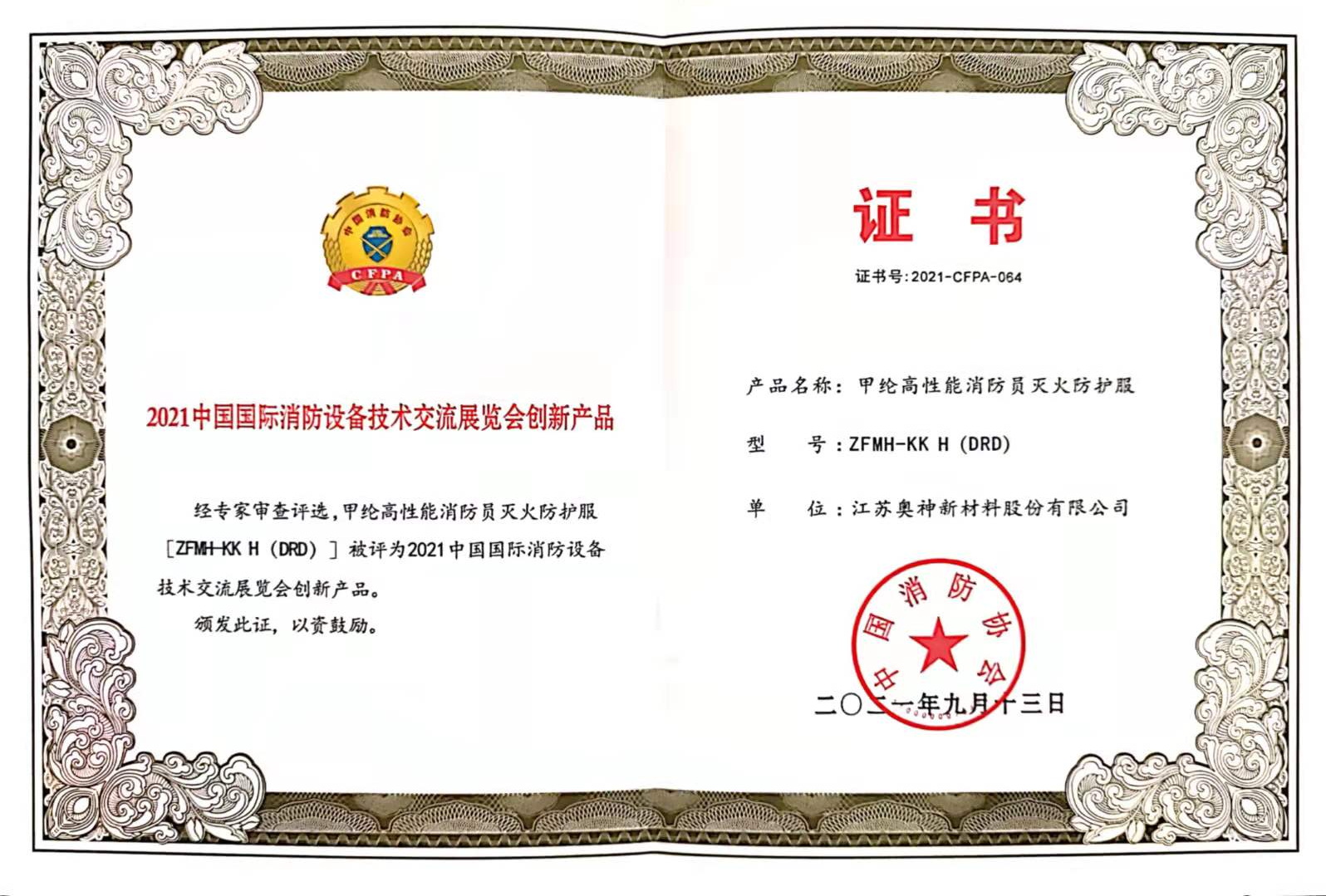 2021年1012日,在北京召开的第十九届中国国际消防设备技术交流展览会上,江苏奥神新材料股份有限公司研发的“甲纶高性能消防员灭火防护服”凭借优异的性能获得“2021中国国际消防设备技术交流展览会创新产品”荣誉称号。此次参与评选的都是来自全国各地实力雄厚的消防领域企业,经历层层评选,甲纶高性能消防员灭火防护服脱颖而出,受到专家的一致好评。