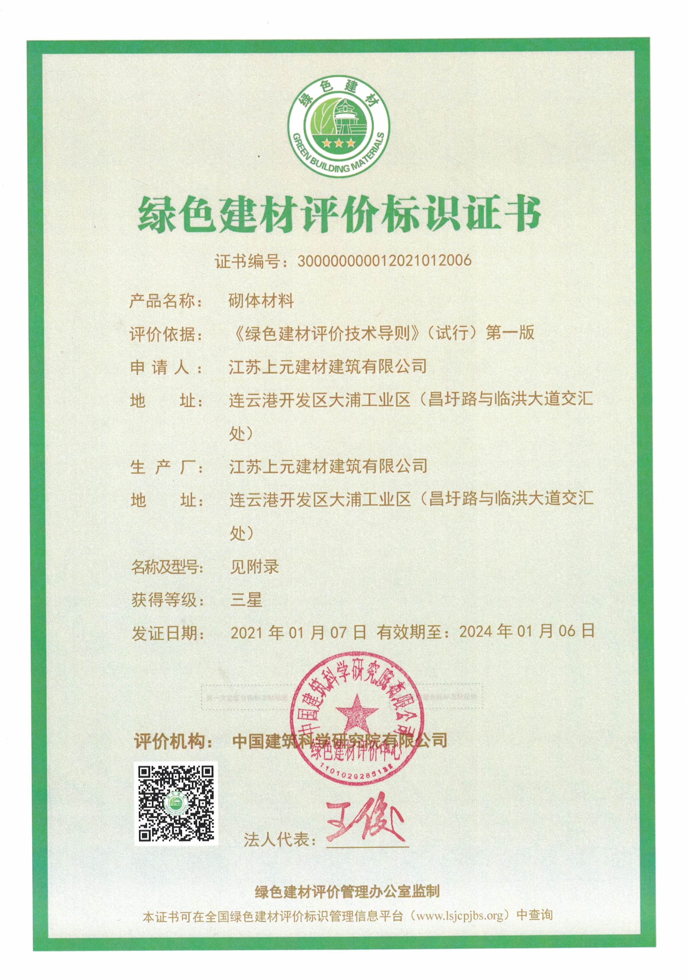 近日,房地产上元建材建筑公司成功获得国家三星级绿色建材评价标识证书,为连云港市首家获得该项荣誉的蒸压加气混凝土板(砌块)类企业。