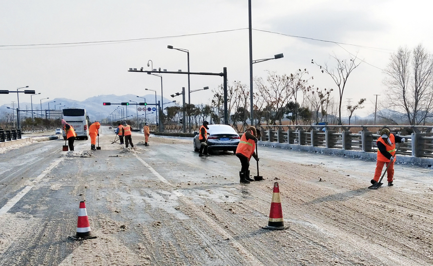 裕升、裕欣、裕祥三家养护公司组织绿化、保洁人员配合除雪车、装载机等机械设备对花果山大道、黄海大道、东方大道、242省道、新光路及大浦路等主干道进行清雪作业;对程圩桥、先锋大桥等桥面易积雪路段以及马山路立交、新光路涵洞等“上跨下穿”路段采用撒氯化钙的方式,加速积雪融化,并安排人员及时扫除积雪,防止路面因低温降雪产生冰冻,对交通安全造成影响;对创智绿园广场、火车站广场及匝道等窗口地段采用人机结合的形式清扫积雪。盛达市政公司、瑞泰服务公司及益丰园林公司在提供铲车、平板车、装载机等机械车辆配合扫雪的同时,积极做好后勤服务,为清雪工作有序开展提供保障。截至到中午,各条主干道积雪已基本清理完毕,道路恢复畅通,保障居民出行和交通安全。