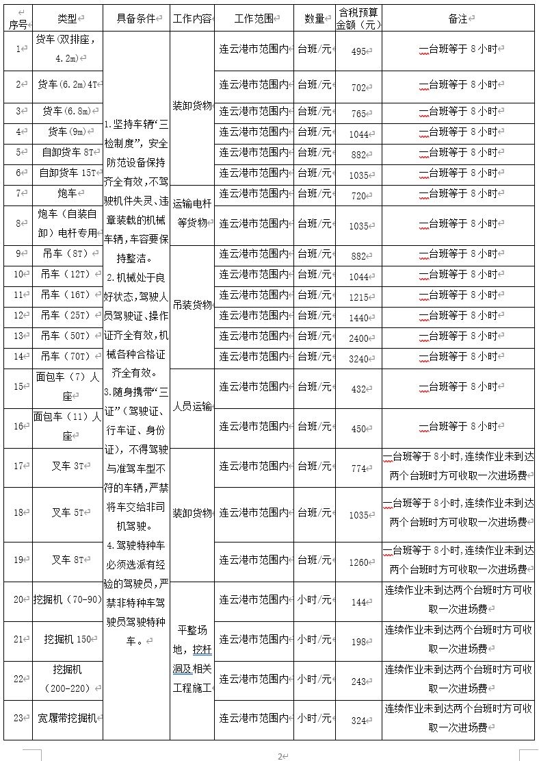 2.采购内容:连云港工投华体会(中国)供电工程分公司机械、车辆租赁