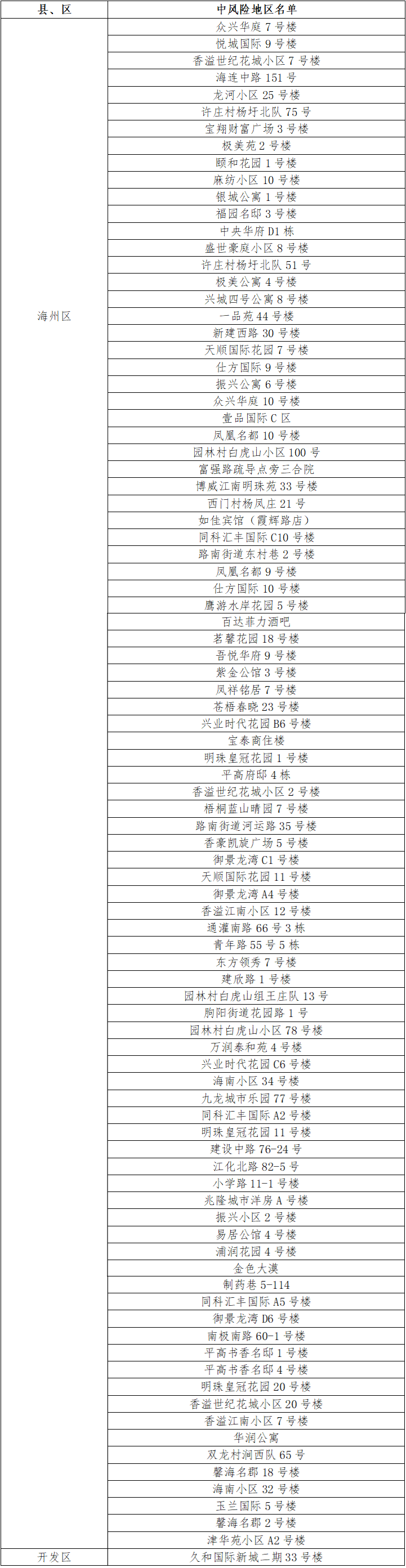 根据国务院联防联控机制有关规定,经市指挥部研究决定,自发布之日起,对我市部分区域疫情风险等级进行调整: