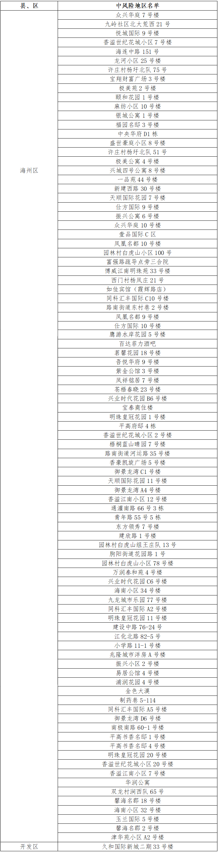 根据国务院联防联控机制有关规定,经市指挥部研究决定,自发布之日起,对我市部分区域疫情风险等级进行调整:海州区赣榆鸡蛋菜煎饼店(洪门菜市场门口)、洪新小区90-71号,连云区万润华泰小区7号楼,灌云县南岗镇岗东村殷庄20号由中风险地区调整为低风险地区。其他地区风险等级不变。调整后全市现有92个中风险地区。 连云港市中风险地区(92个)