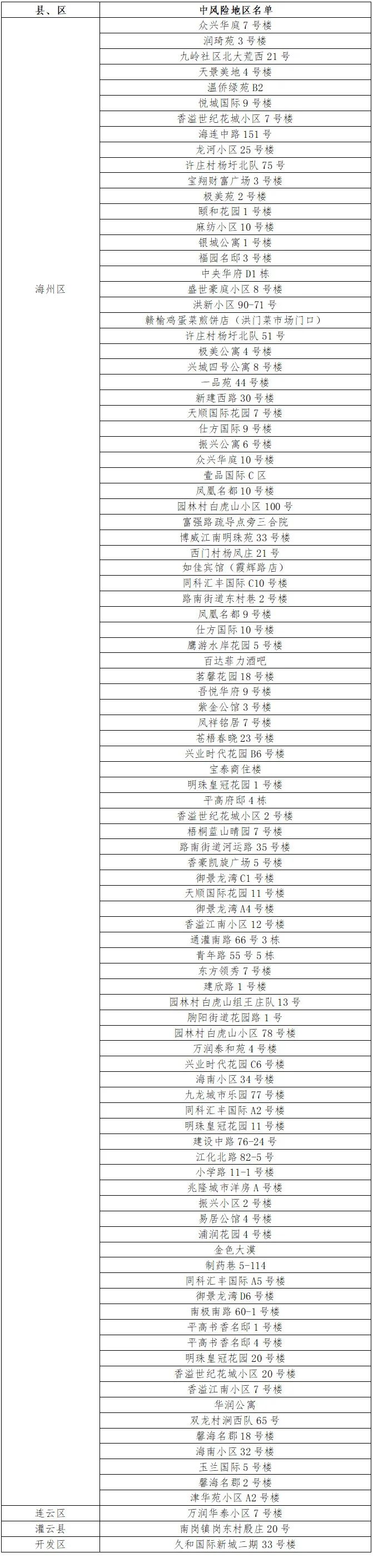根据国务院联防联控机制有关规定,经综合评估研判,市指挥部决定,自发布之日起,将海州区明珠皇冠花园20号楼、香溢世纪花城小区20号楼、香溢江南小区7号楼、华润公寓、双龙村涧西队65号、馨海名郡18号楼、海南小区32号楼、玉兰国际5号楼、馨海名郡2号楼、津华苑小区A2号楼调整为中风险地区。