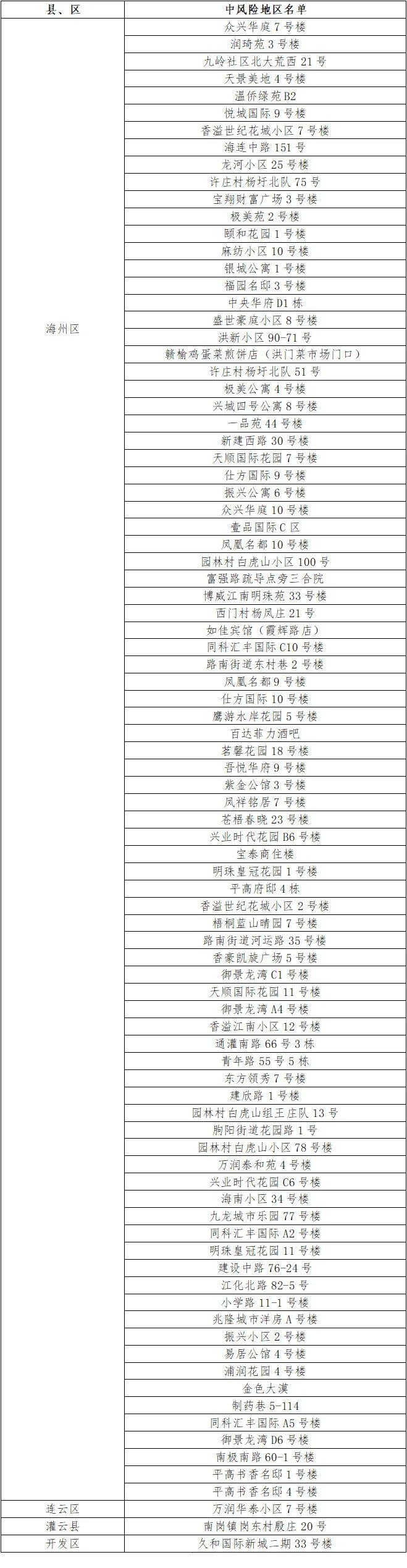 根据国务院联防联控机制有关规定,经综合评估研判,市指挥部决定,自发布之日起,将海州区浦润花园4号楼、金色大漠、制药巷5-114、同科汇丰国际A5号楼、御景龙湾D6号楼、南极南路60-1号楼、平高书香名邸1号楼、平高书香名邸4号楼调整为中风险地区。