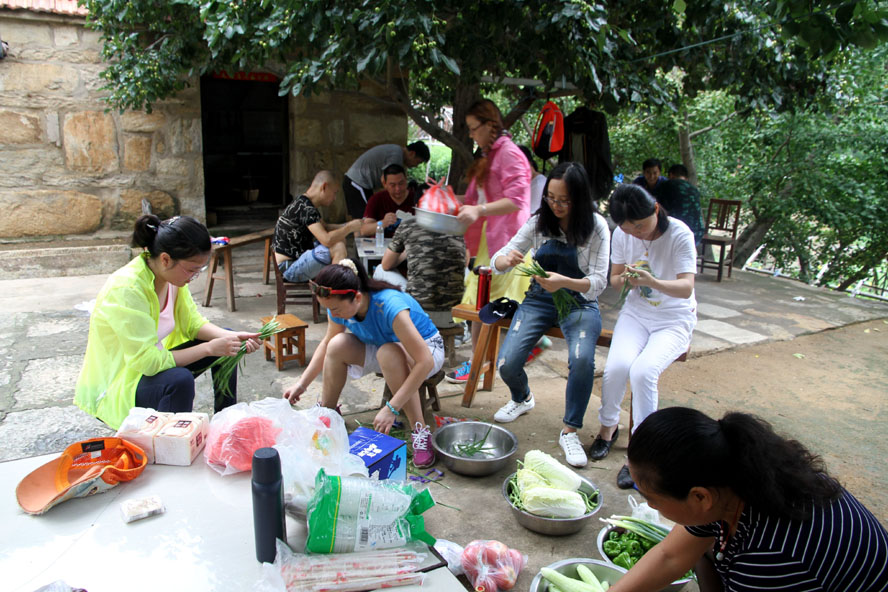 这处清幽洁净的农家小院成了队员大展厨艺的用武之地,大家迅速整理好自带的蔬菜食物,按各自特长分好工。有清理蔬菜的、有和面的、有刷锅烧水的,那些实在帮不上忙的便凑到一起围坐在院中的树荫下开始“掼蛋”比赛。厨房中,面对农户家中的那两口大草锅,负责炒菜的队员直挠头,因为在城里实在是无处寻觅这样的锅灶了,更不知该如何才能把这灶火烧得旺旺的。这时华体会在线的女队员刘惠自告奋勇,勇敢地担起了“伙头军”的重任。还别说,在经过户主老大爷的一番指点后,一会儿功夫这灶火便被她烧得有规有距起来。很快,灶房便飘出了炒肉、煎蛋的香味。此时,院中也已摆起了包旱饺的阵式来了。面已和好,两种口味的馅料也已备好。有负责擀饺子皮的,有负责包饺子的,队员们赛速度、赛质量,两种口味的饺子被分别摆放在各自的簸箕里。看着形态各异的饺子,大家忍不住评价起来,最终有队员被冠上了“专业面点师”的雅号。人多力量大,当所有的菜肴、面点摆到长桌上时,大家开心不已,虽然这算不上美味佳肴,但自己的劳动果实却总是最美味。