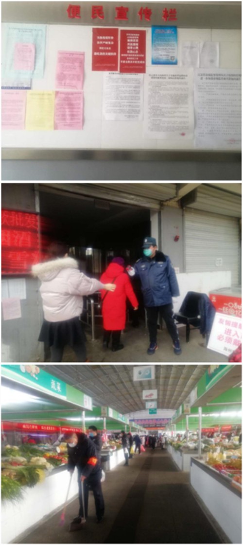 强化市场内部管控。为进一步避免人群大规模聚集,调整市场开放、关闭时间,缓解人流量,劝导群众不信谣、不传谣,无需恐慌抢购。督促农贸市场100多户经营户每天提前全部做好物资的摆放,所有进出市场人员保留1个进出口通道依次进出,并指派专人在入口负责体温检测;对进入市场的等各类车辆实行指定区域有序停放,确保市场内无占道现象。