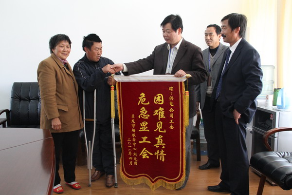 4月28日,巨龙农贸市场特困职工刘元国拄着双拐,在妻子陪伴下来公司送上锦旗,感谢干部职工的爱心捐助。去年初,下岗后在外谋生的刘元国因讨要欠款发生车祸,腰部、腿部严重骨折,花费10万余元,全家借钱度日。为让刘家生活得到改善,春节前全公司发起献爱心活动,共为刘元国募集钱款万余元。(司宣)