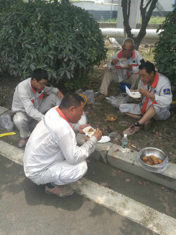 6月28日,在炎炎烈日之中,在地面温度达40多度的中午时间,位于池月路富佳搅拌站的环网柜旁,满头大汗的于广兵、孙忠清、孙正宏、周玉民等顾不上休息,正盘坐在树荫下对付着吃着快餐,与接下来的抢修工作争抢时间。随后这一画面被笔者用手机捕捉下来。笔者相信,这不仅仅是一张坚守在一线的工人们高温下吃饭的照片,更是一张当前乃至今后一个时期,台北供电所员工们在“高质发展、后发先至”新形势下“爱企奉献,爱岗敬业”的真实写照。