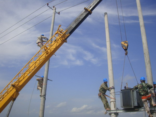 连云新城三期供电线路紧贴海堤边。受海堤建设进度和海风海潮的影响,低矮的坝堤经常被风刮起的海浪浸顶,石块突起,洼水涟漪,淤泥缠足,堤边路面凹凸不平,道路仅限一辆车通行,拥挤不堪,工程施工难度极大。为提升速度,加快进度,台北供电所克服困难,紧锣密鼓地展开工作,以期早日完工。现场勘察地形地貌,了解潮汐运动规律,制定施工计划,设计措施方案,组织人力,采购材料,投入施工。施工人员采用弹性工作时间,利用落潮时机,抢运电杆,及时立杆和装配。职工们发扬不怕苦,不畏难的精神,不惧海风吹脸、海水浸衣,爬上距离海平面二十多米仿佛摇摆不定的高杆,悬在空中一丝不苟地操作,保障了工程的全面竣工。