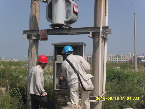 9月18日,灌西供电所领导分别带队,对辖区内用户进行拉网式检查,发现隐患立即处理,确保两节期间安全供电。(图为检查变压器及配电箱)(王志勇)