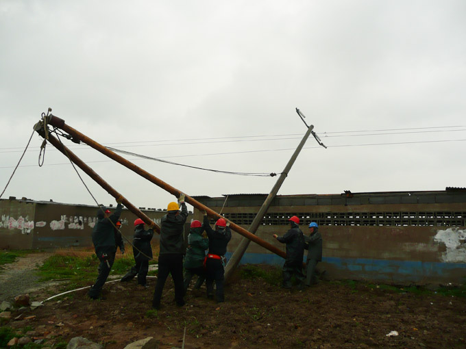 2月3日(正月初九)早上五点多,台北供电所电力抢修值班室电话急促响起,变电所操作工反映10KV太和线跳闸失电。10KV太和线是台北供电所非常重要的一条供电线路,是向顺天木业、苏交华体会(中国)、市政沥青等大型企业供电的重要通道,失电意味着企业生产停工。接警后,供电所外线组组长孙忠青立刻带人沿线全面检查。经过两个小时的排查,终于发现处于线路末端的高速公路低压线路的五根电杆被施工的挖掘机 撞断拉折。获此情况,所领导立即组织人员,准备材料,协调吊车,安排运送电杆。这时天空正下着小雨,更增加了施工的难度。为了尽快抢修,恢复供电,抢险队伍加速向事发地点开进,寒风中的雨滴,打在职工的头上脸上,大家毫不在意,一心扑在抢修线路上。运送电杆的道路泥软地陷,机器吊装遇到死角,他们就肩扛手拉。为了抢时间,争速度,他们中午就在工地吃点快餐。在全体职工的共同努力下,到下午五点左右全面完成了抢险工作。