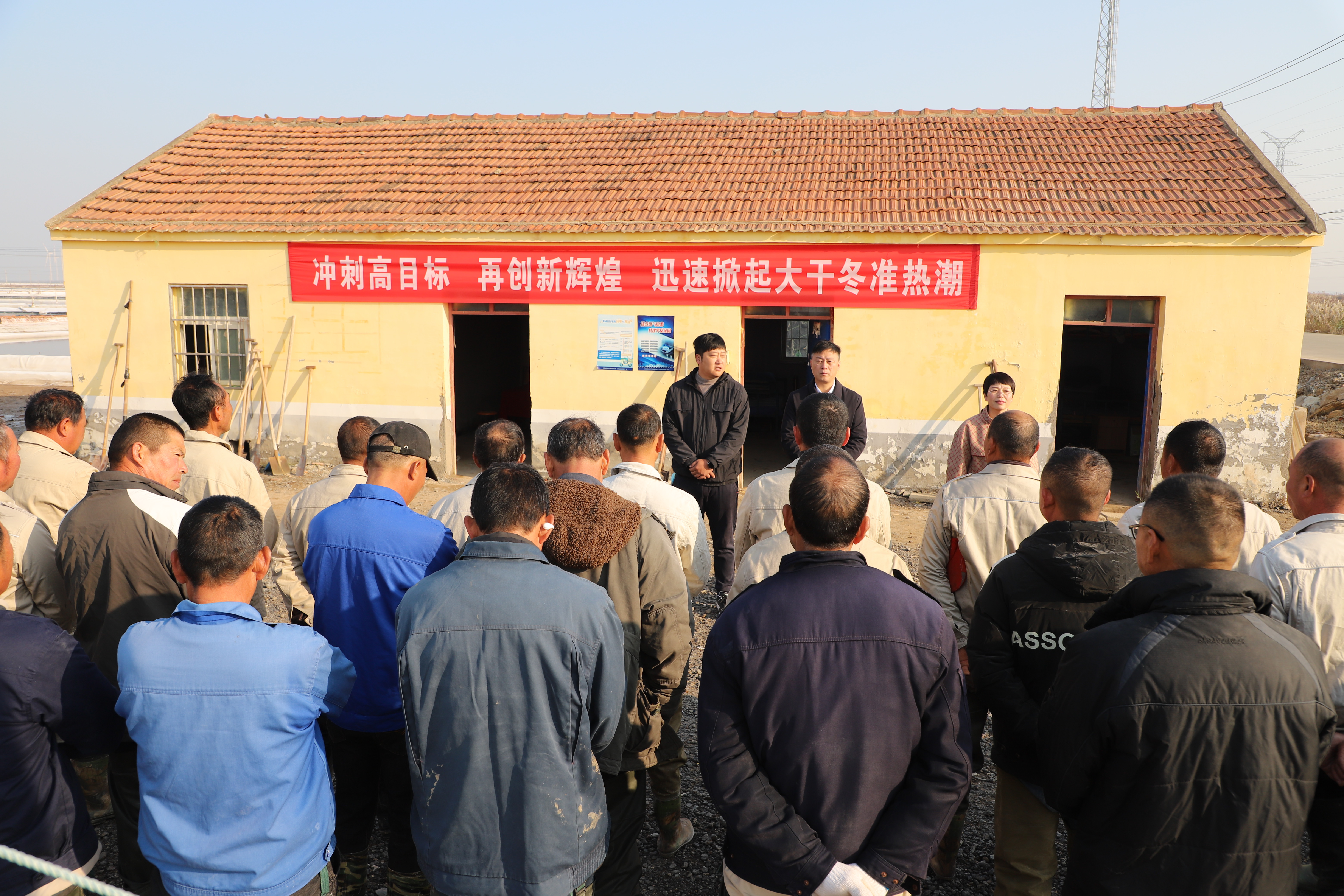 在新河制盐分公司12班滩头,常务副总经理徐一林对冬准工作提出要求,总经理吴卫平宣布“‘薪火灌筑 匠星西传’师徒结对擂台赛”正式开始!