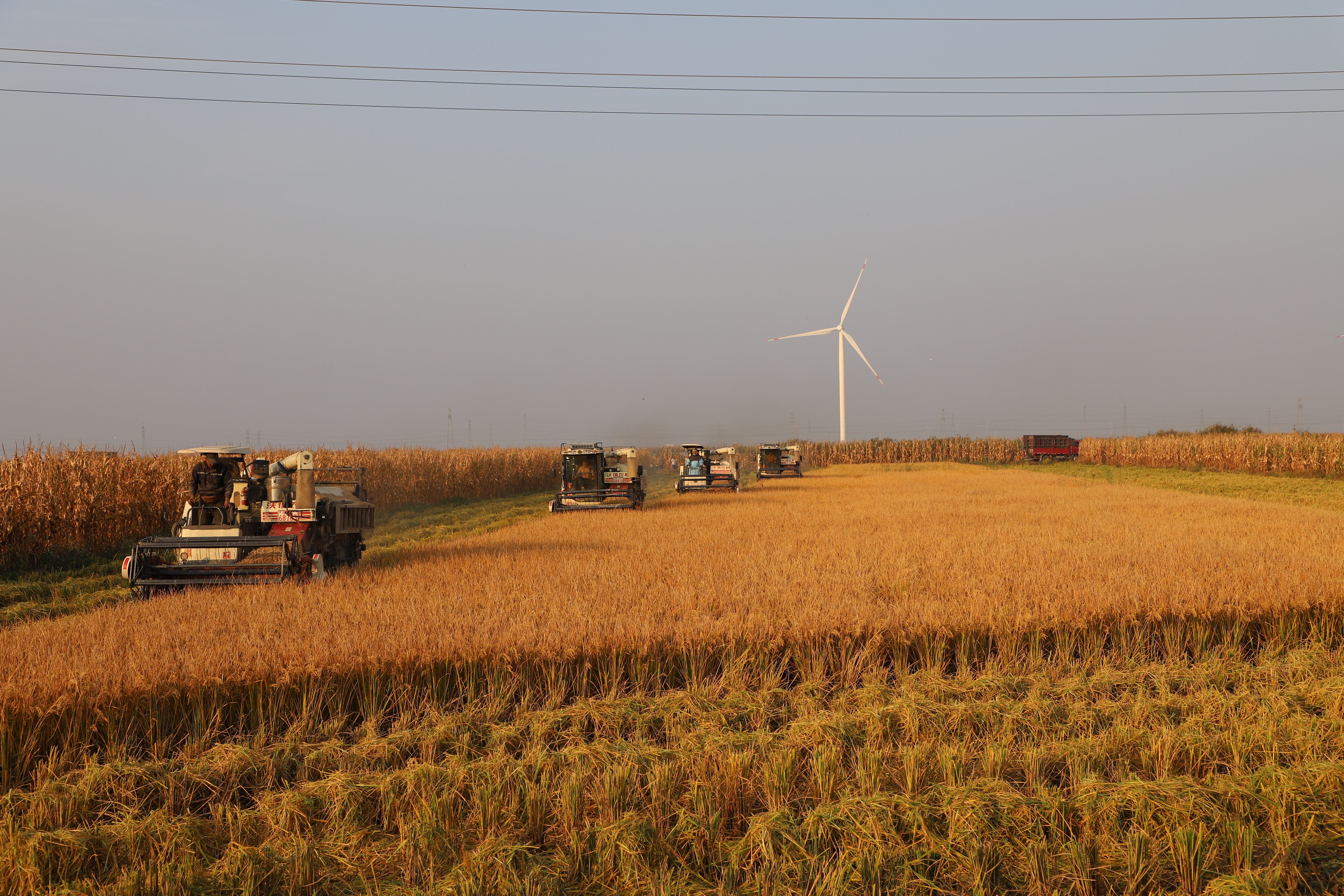 秋高气爽,稻谷飘香。当下,正是水稻收割的大忙季,田间稻浪翻滚,马达轰鸣,一台台收割机在稻田里来回穿梭,割稻、脱穗、粉碎稻杆一气呵成,一垄垄沉甸甸的稻谷很快便收获归仓,田间一派繁忙、丰收的景象。