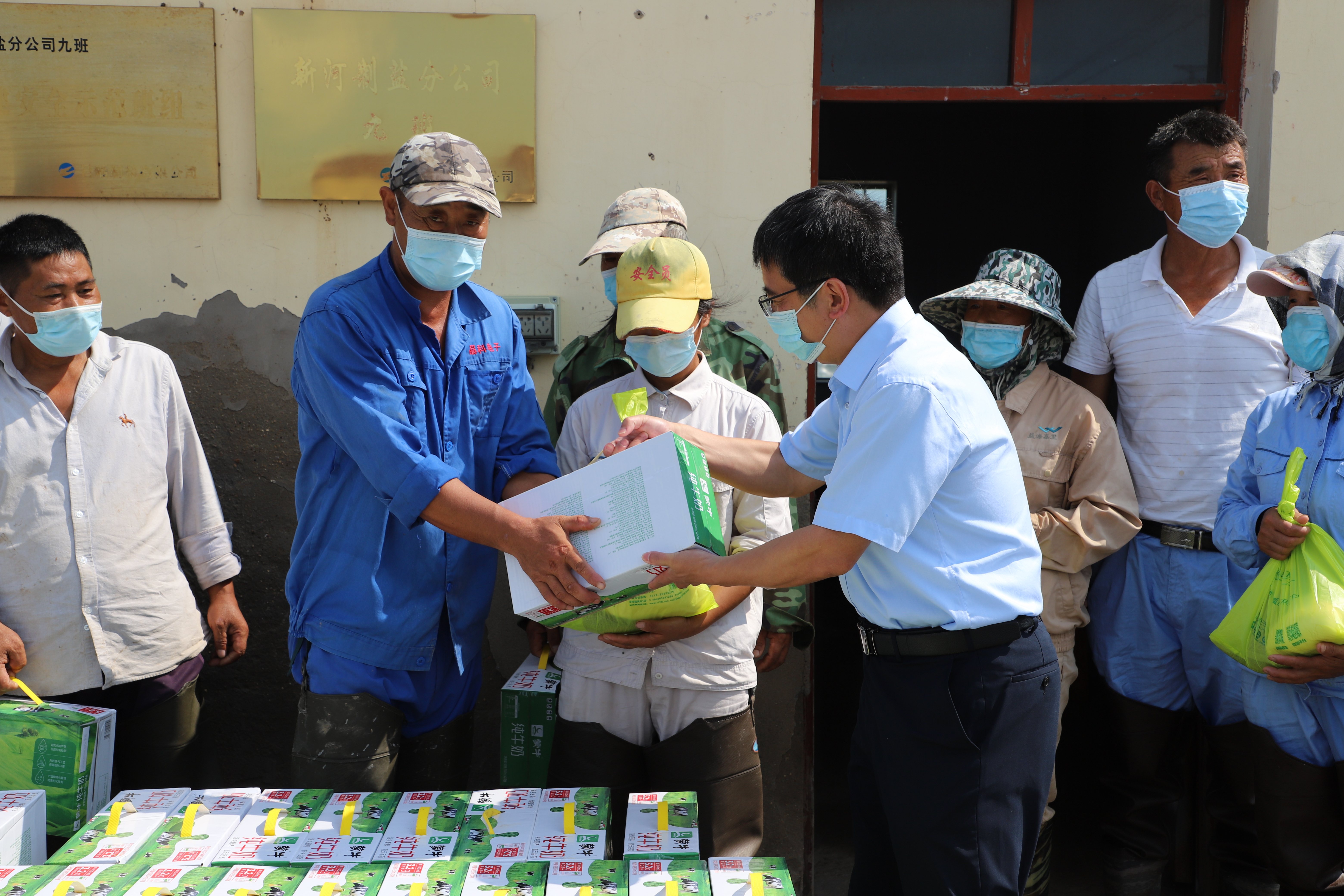 在新河制盐分公司九班,杨国新代表华体会(中国)公司向坚持在盐业生产一线的工人们表示深切的感谢和慰问,感谢他们在烈日下为华体会(中国)所付出的辛劳,并叮嘱他们要避开高温时段,科学合理安排好工作时间,既要保证生产质量和进度,又要注意防疫和高温生产安全。