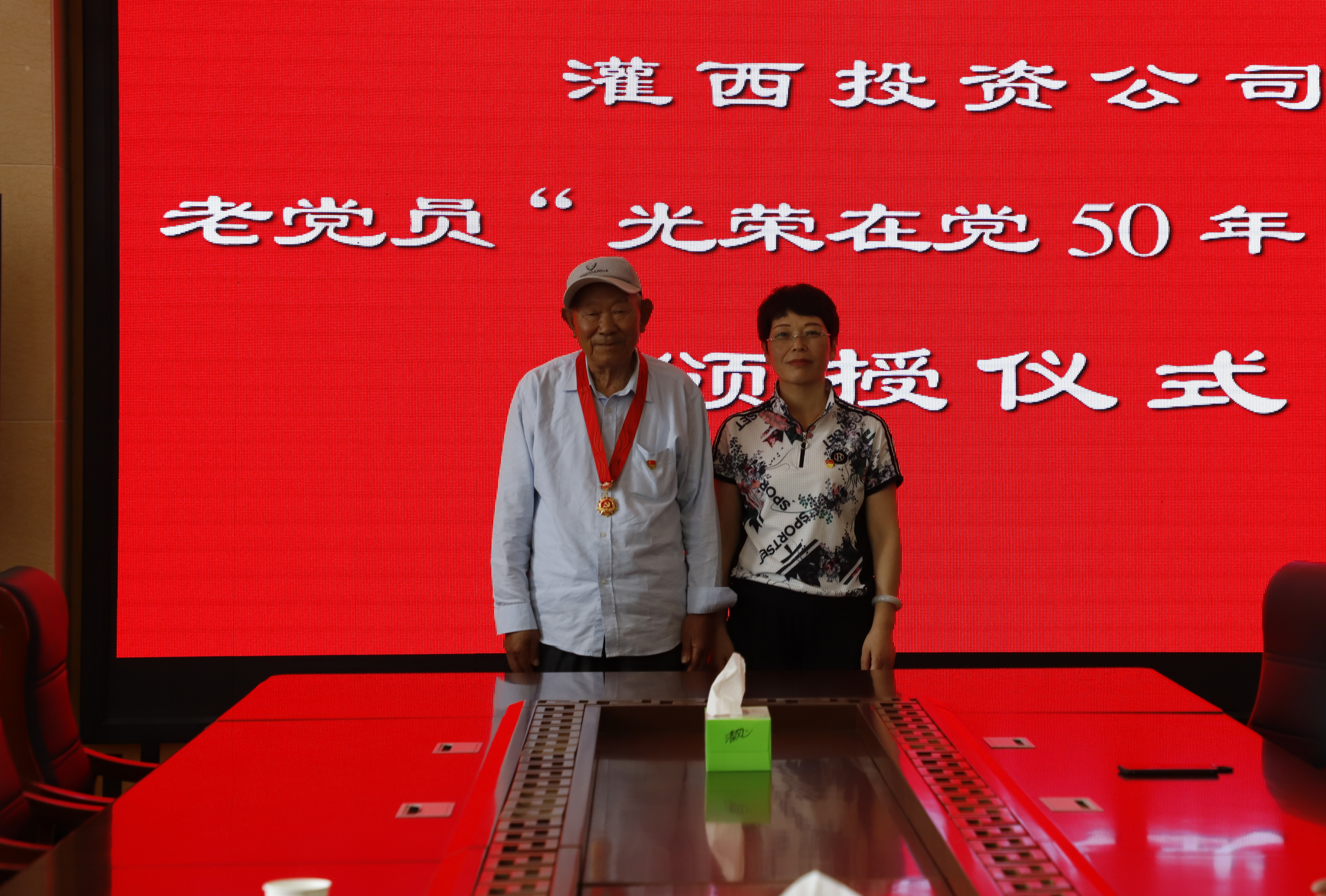 “五十年党龄,五十载光荣”。6月29日下午,灌西“光荣在党50年”纪念勋章颁授仪式在机关三楼举行,投资公司党委副书记、工会主席王宏向党龄达到50年的两位老党员代表颁发纪念章,工会、党群、纪委人员参加颁发仪式。