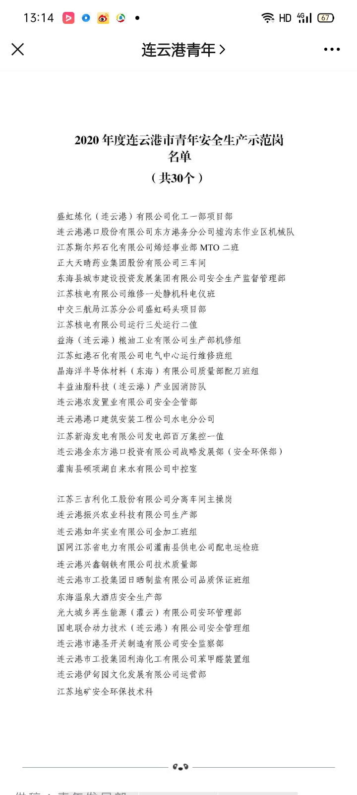 11月12日,共青团连云港市委员会公布2020年度连云港市青年安全生产示范岗名单,连云港市工投华体会(中国)日晒制盐公司品质保证班组被评为2020年度连云港市青年安全生产示范岗。