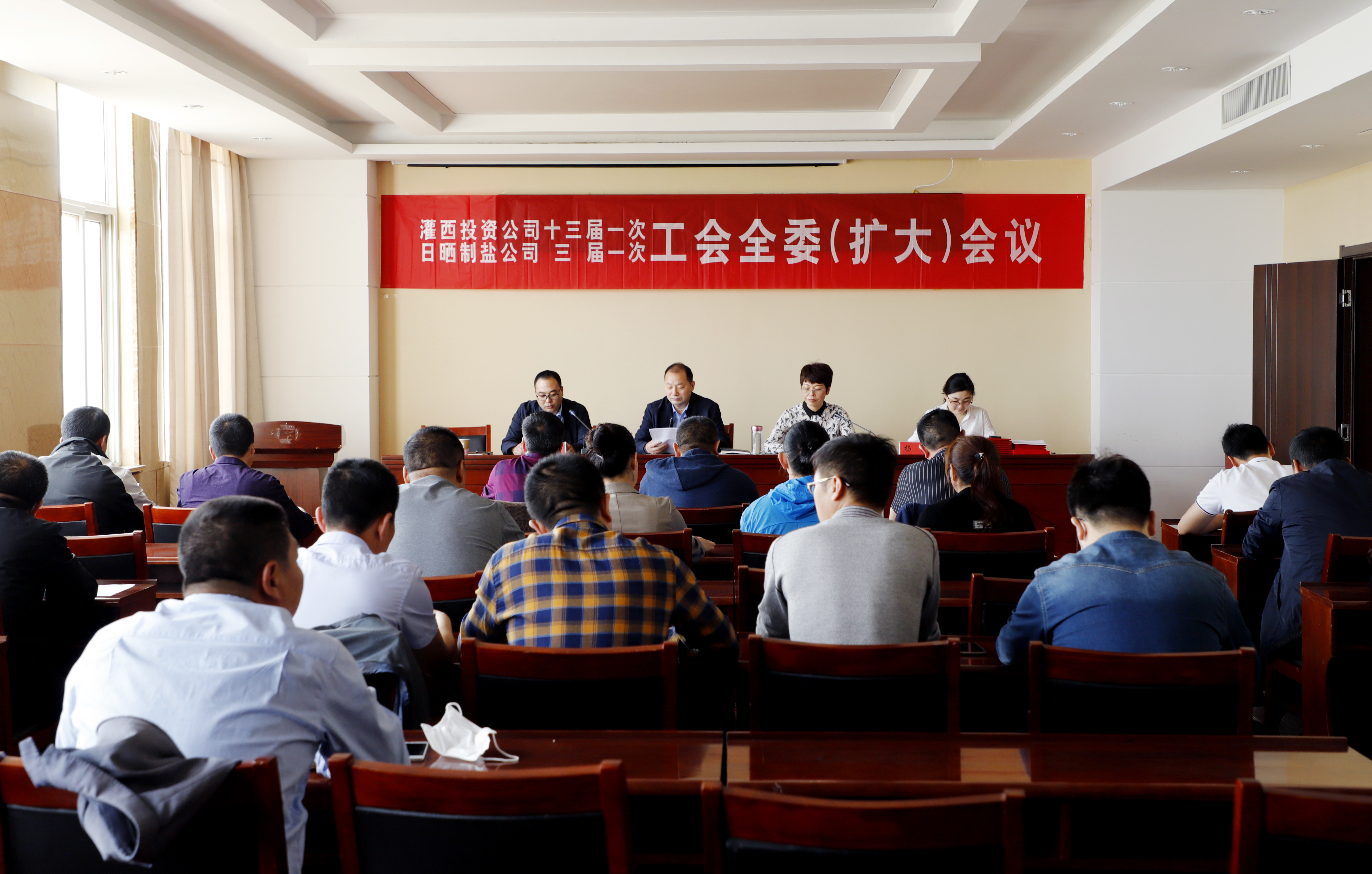 5月20日上午,灌西投资公司召开十三届一次、日晒制盐公司三届一次工会全委扩大会议,公司党委书记、董事长、总经理李国文出席会议并讲话,工会主席王宏作工作报告。工会委员会全体委员,各单位工会主席、女工委主任参加会议。