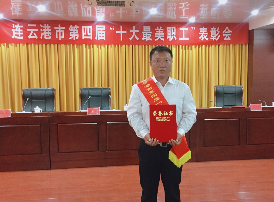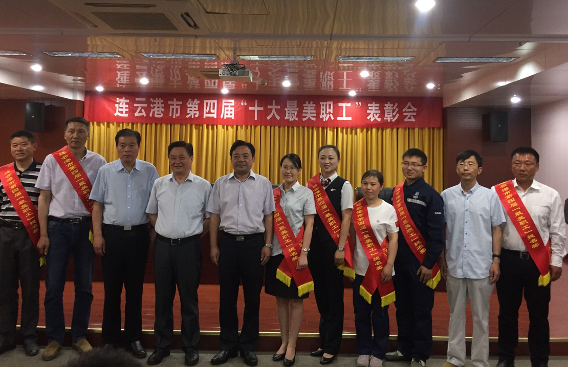 近日,在连云港市第四届港城“十大最美职工”表彰会上,日晒制盐新河分公司八班班长祝星星荣获“十大最美职工”提名奖。在表彰会上,市总工会主席郑平、丁维杰书记、宣传部副部长李超领导与获奖人员一起合影留念。