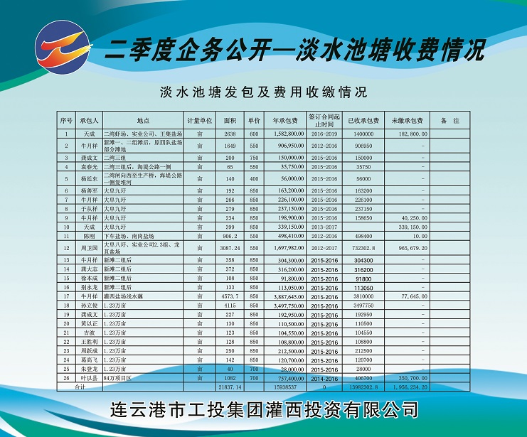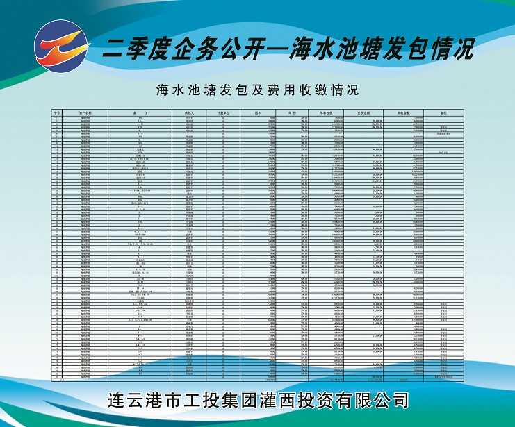 2、海水养殖池塘发包及费用收缴情况。共发包海水养殖池塘面积13073.83亩,应收租赁费421.787万元,已收租赁费221.39万元,欠收租赁费200.397万元,收缴率为52%。