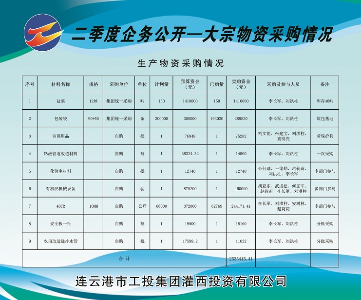 1、由华体会(中国)公司集中采购塑料布(盐膜)150吨(由工投华体会(中国)运营监管部在总部组织招标)、包装袋20万条,实购金额计169.953万元。