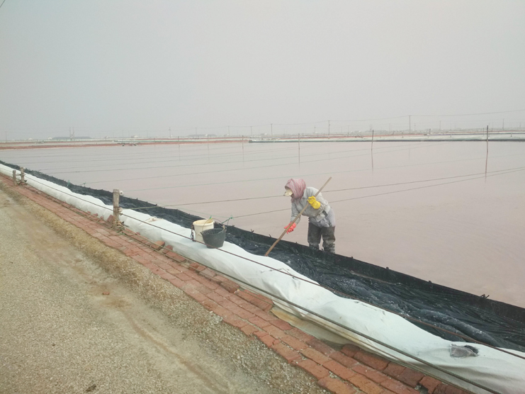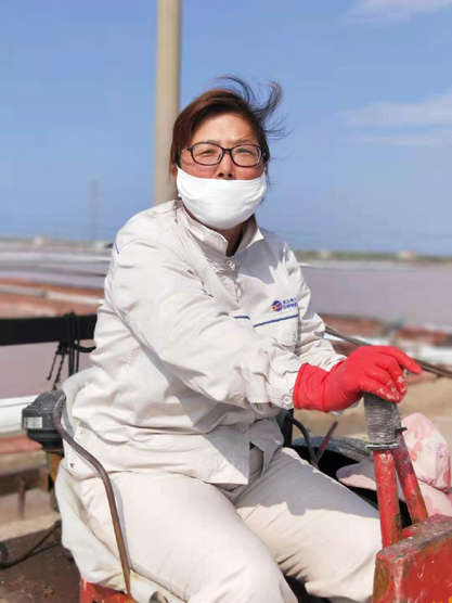 每一个女孩都喜欢美丽的衣服,都喜欢把自己装扮得漂亮迷人。可是工作的特殊性不允许盐滩工“貌美如花”。周娟,37岁,新河制盐分公司5班一名普通的女工,她关注班组集体事务,能够团结、关心班组女工,并积极带领女职工昂扬向上,奋发有为,为单位盐业生产多作贡献。周娟特别注重对新上岗的员工培训教育工作,她总是不厌其烦讲解原盐操作流程及工作中的注意事项和安全隐患,毫不保留将自己多年的经验传授给大家。炎热的夏天,当大家坐在办公室,吹着空调、喝着冰水时,她和她的同事依旧在盐滩忙碌着,娇嫩的皮肤被晒得黝黑。尽管如此,她依然每天驾驶着活茬机,一遍又一遍地游走在盐田,将汗水撒在工投。
