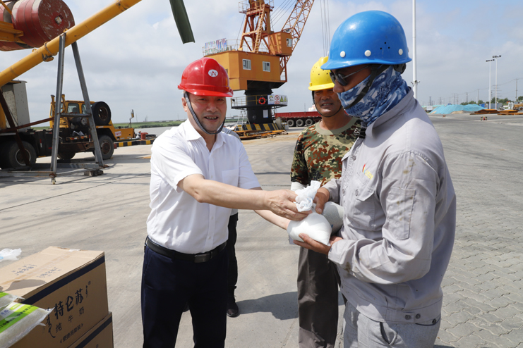 7月28日,投资公司党委书记、董事长李国文,党委副书记王宏一行深入宵洋物流公司码头生产作业现场,走访慰问奋战在一线的员工,为一线员工送上牛奶、绿豆等防暑降温物品,在酷热的夏日带来丝丝清凉。