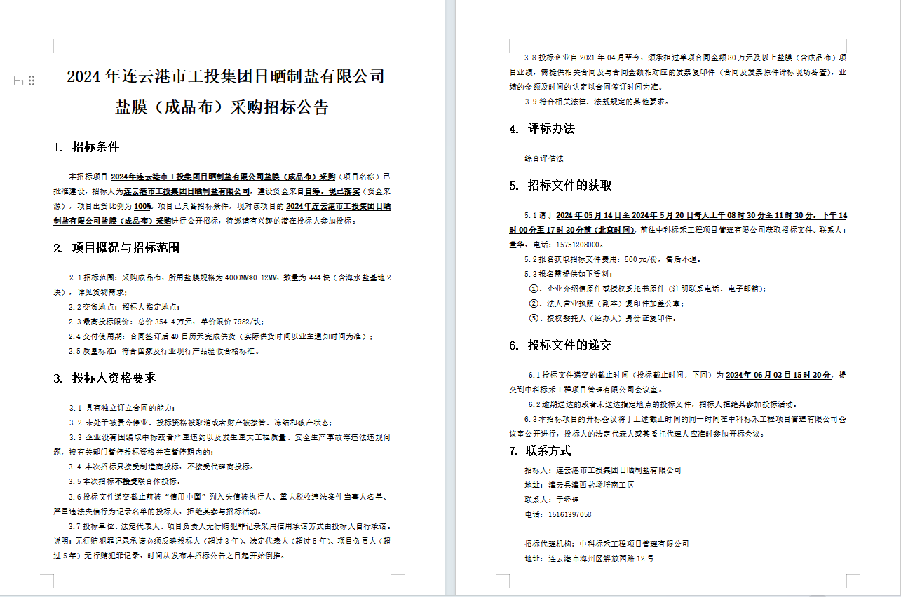 2024年连云港市工投华体会(中国)日晒制盐有限公司盐膜(成品布)采购招标公告