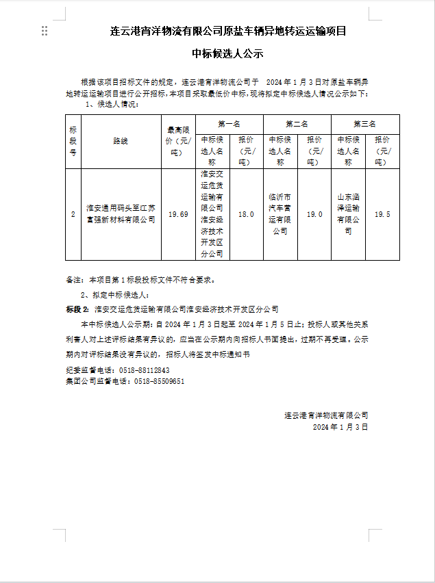 连云港宵洋物流有限公司原盐车辆异地转运运输项目中标候选人公示