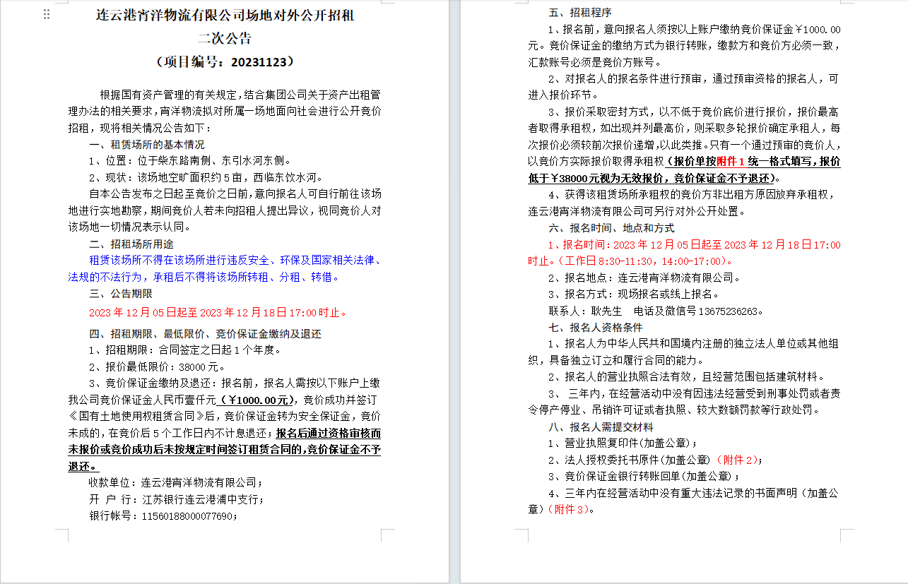 连云港宵洋物流有限公司场地对外公开招租二次公告