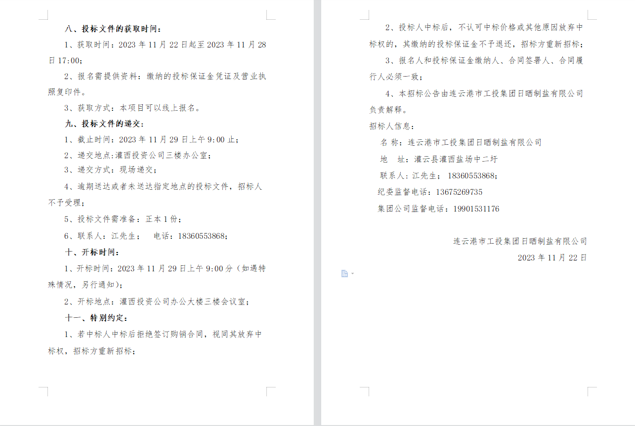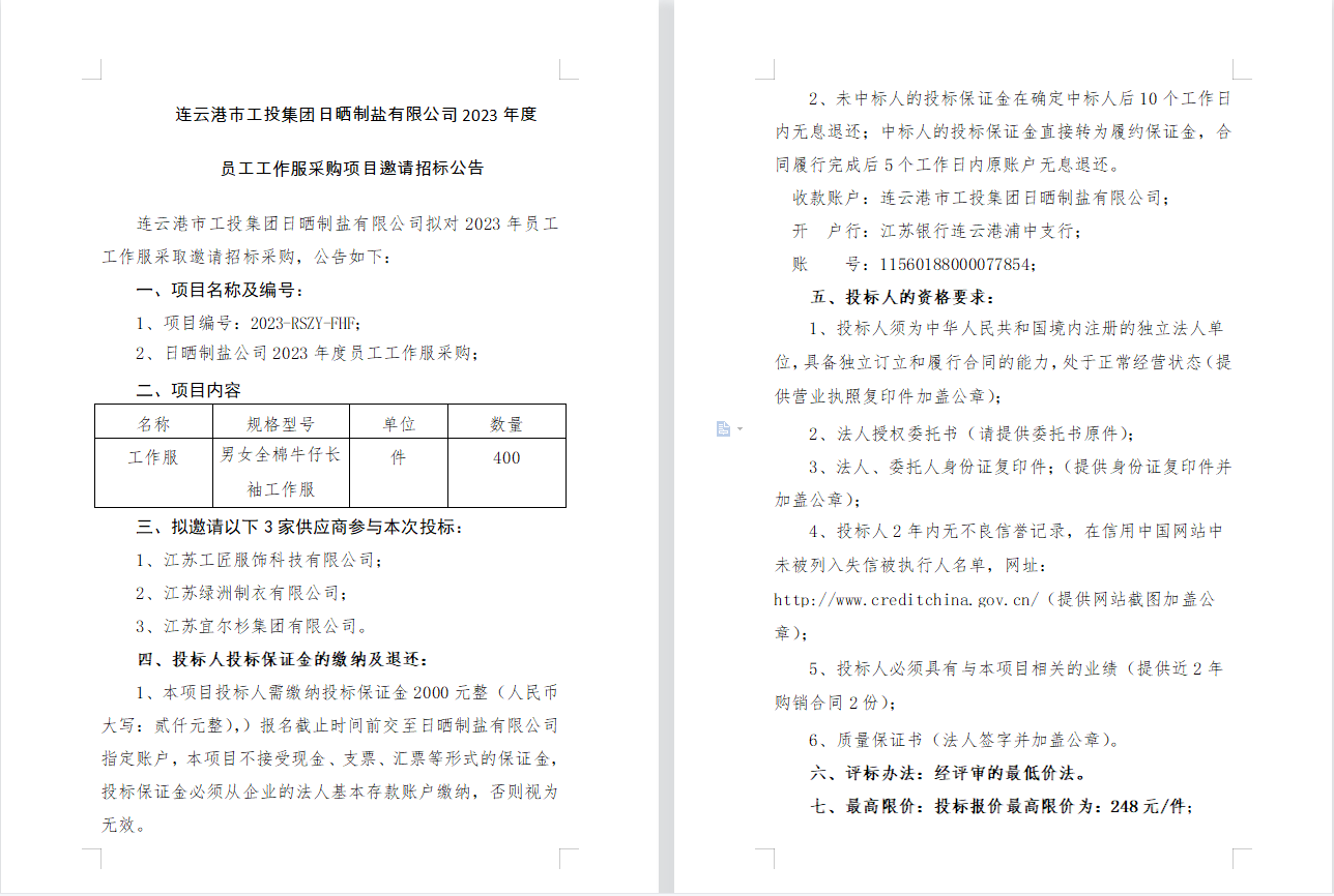 连云港市工投华体会(中国)日晒制盐有限公司2023年度员工工作服采购项目邀请招标公告