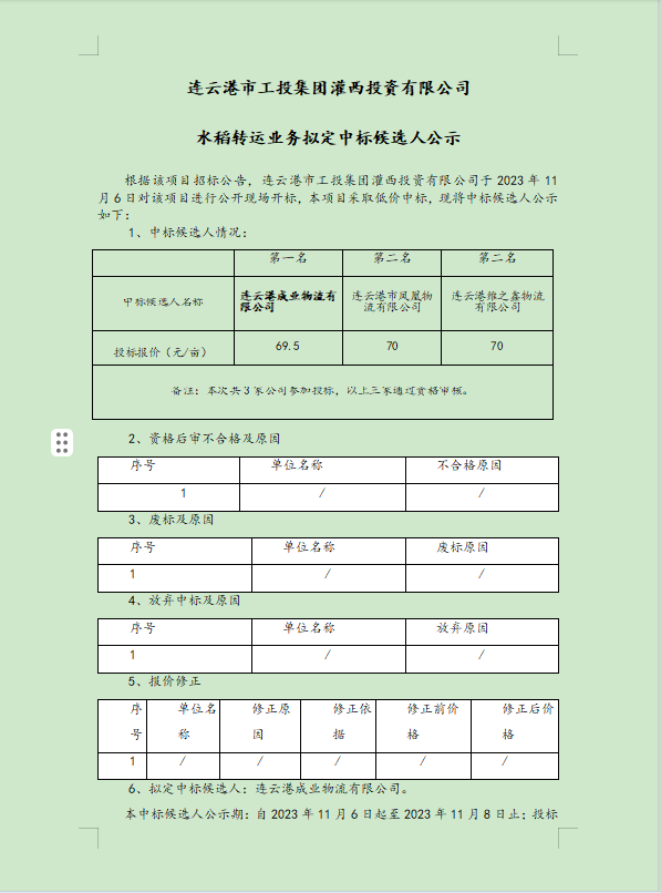 连云港市工投华体会(中国)灌西投资有限公司水稻转运业务拟定中标候选人公示