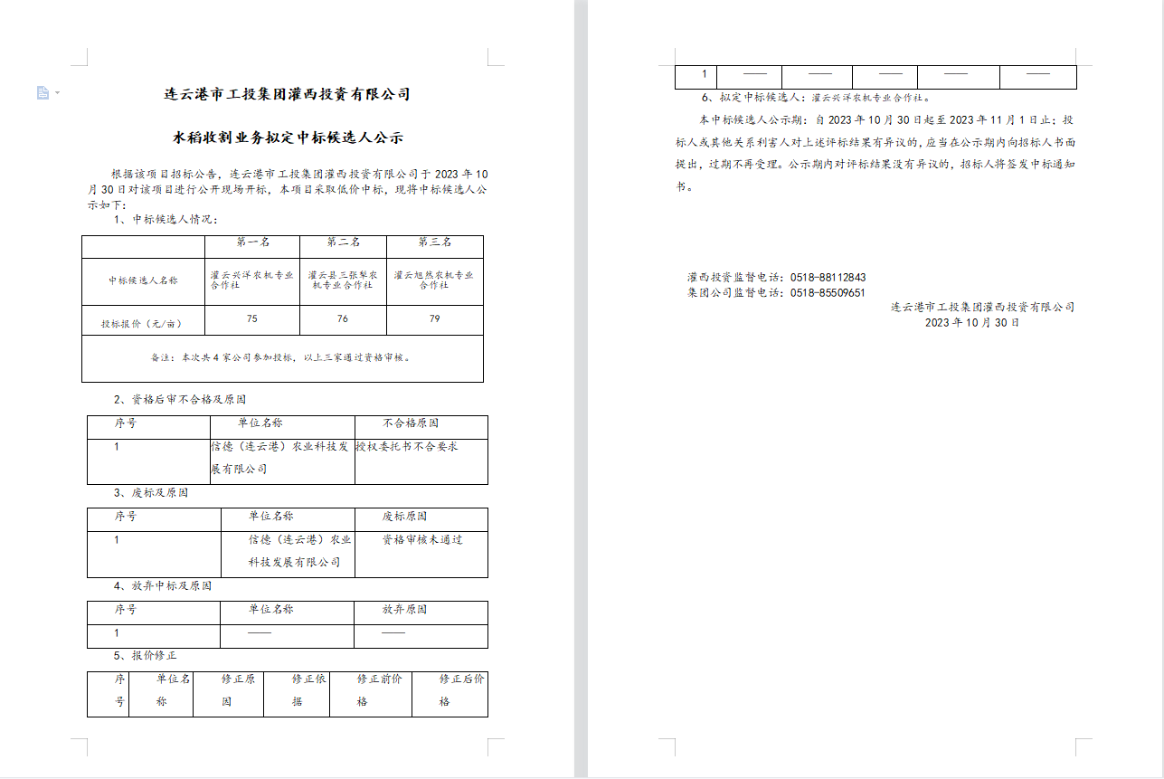 连云港市工投华体会(中国)灌西投资有限公司水稻收割业务拟定中标候选人公示