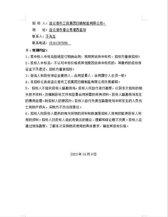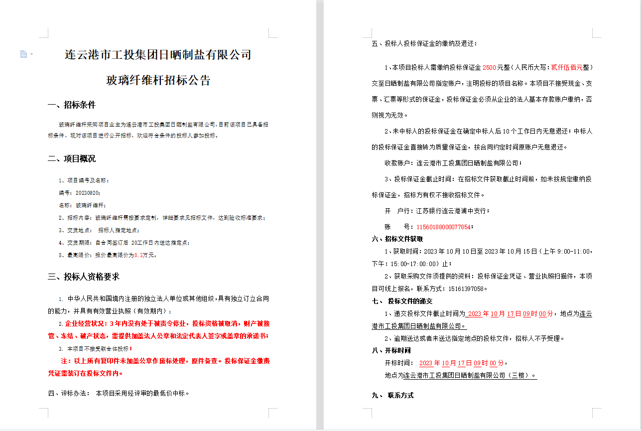 连云港市工投华体会(中国)日晒制盐有限公司 玻璃纤维杆招标公告
