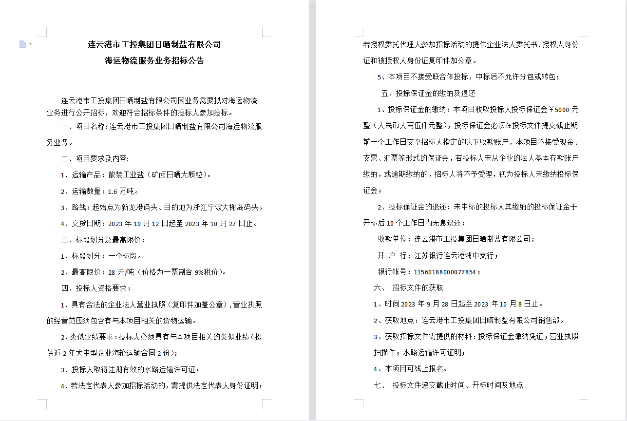 连云港市工投华体会(中国)日晒制盐有限公司海运物流服务业务招标公告