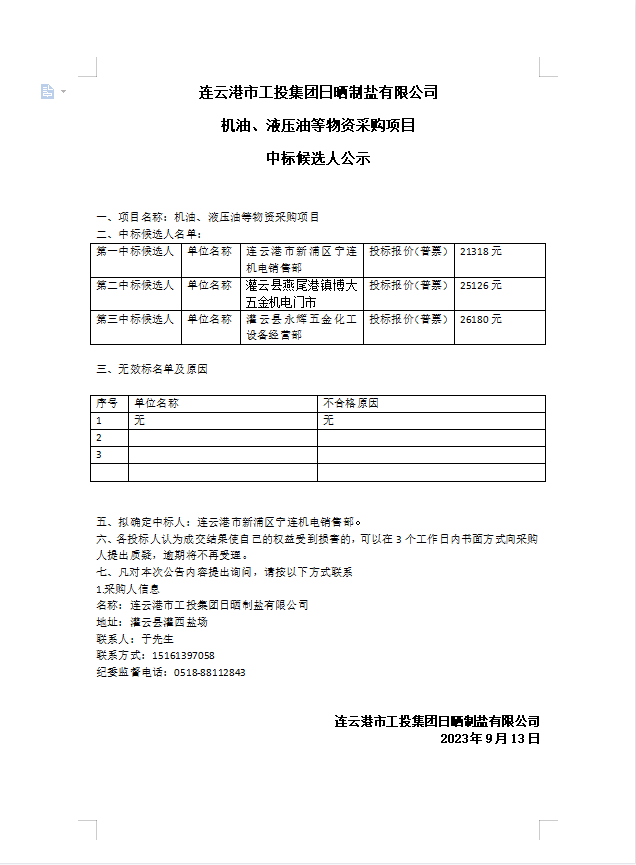 连云港市工投华体会(中国)日晒制盐有限公司 机油、液压油等物资采购项目中标候选人公示