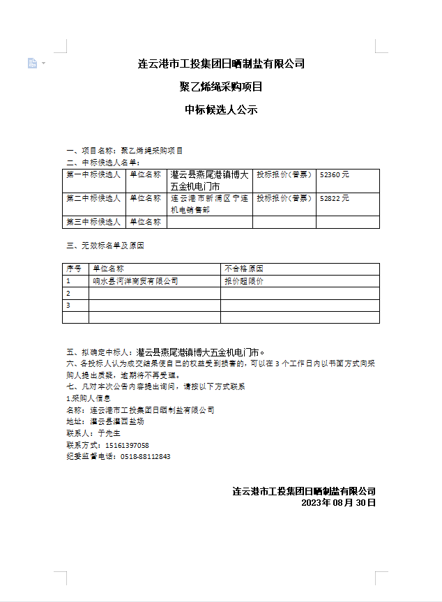 连云港市工投华体会(中国)日晒制盐有限公司聚乙烯绳采购项目中标候选人公示