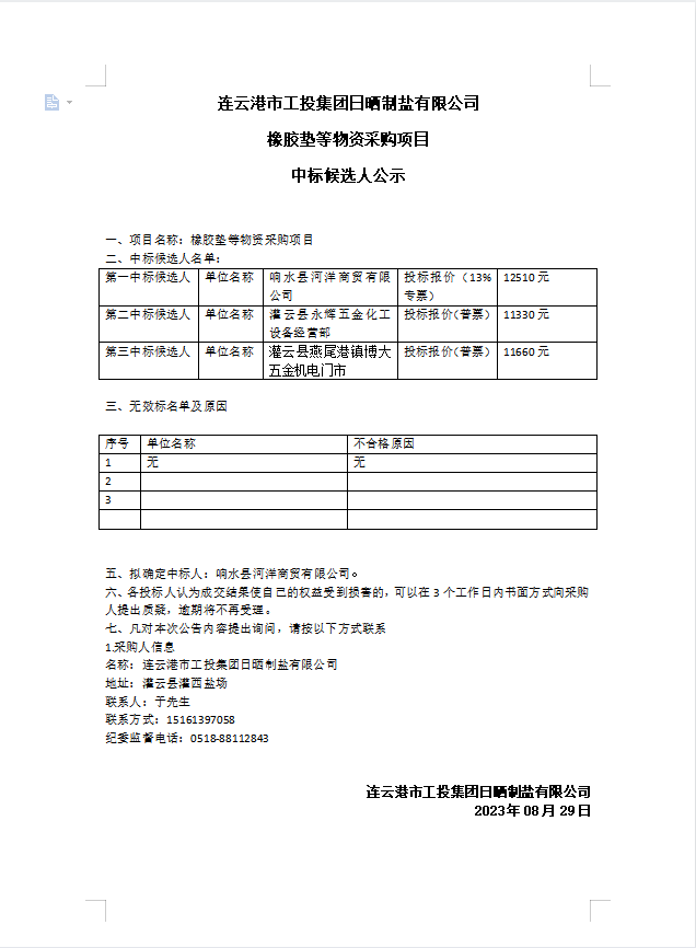 连云港市工投华体会(中国)日晒制盐有限公司橡胶垫等物资采购项目中标候选人公示