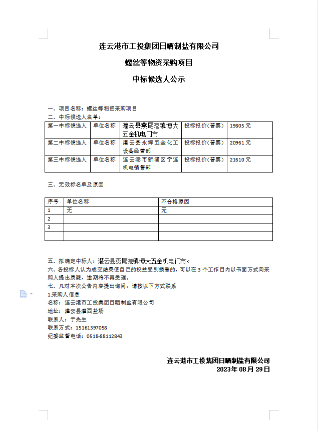 连云港市工投华体会(中国)日晒制盐有限公司螺丝等物资采购项目中标候选人公示