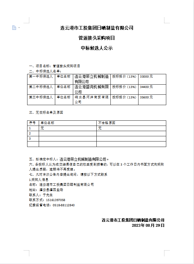 连云港市工投华体会(中国)日晒制盐有限公司 管道接头采购项目中标候选人公示