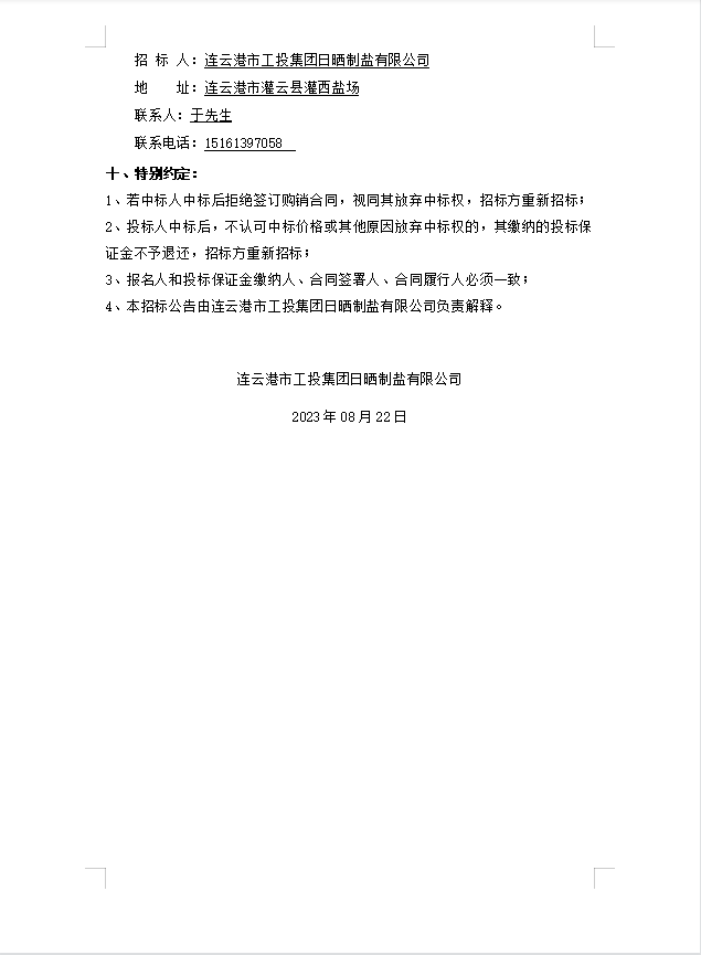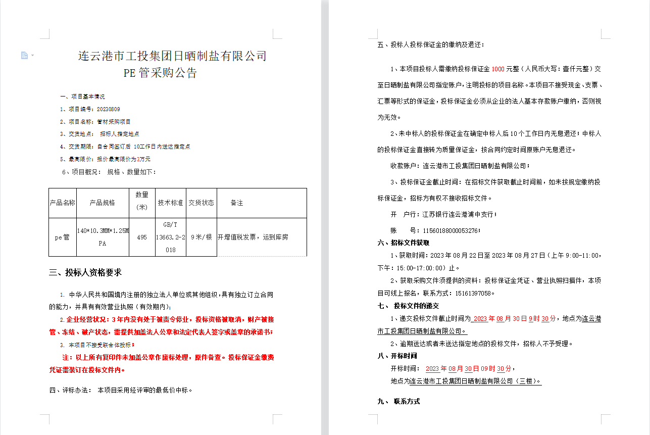 连云港市工投华体会(中国)日晒制盐有限公司PE管采购公告