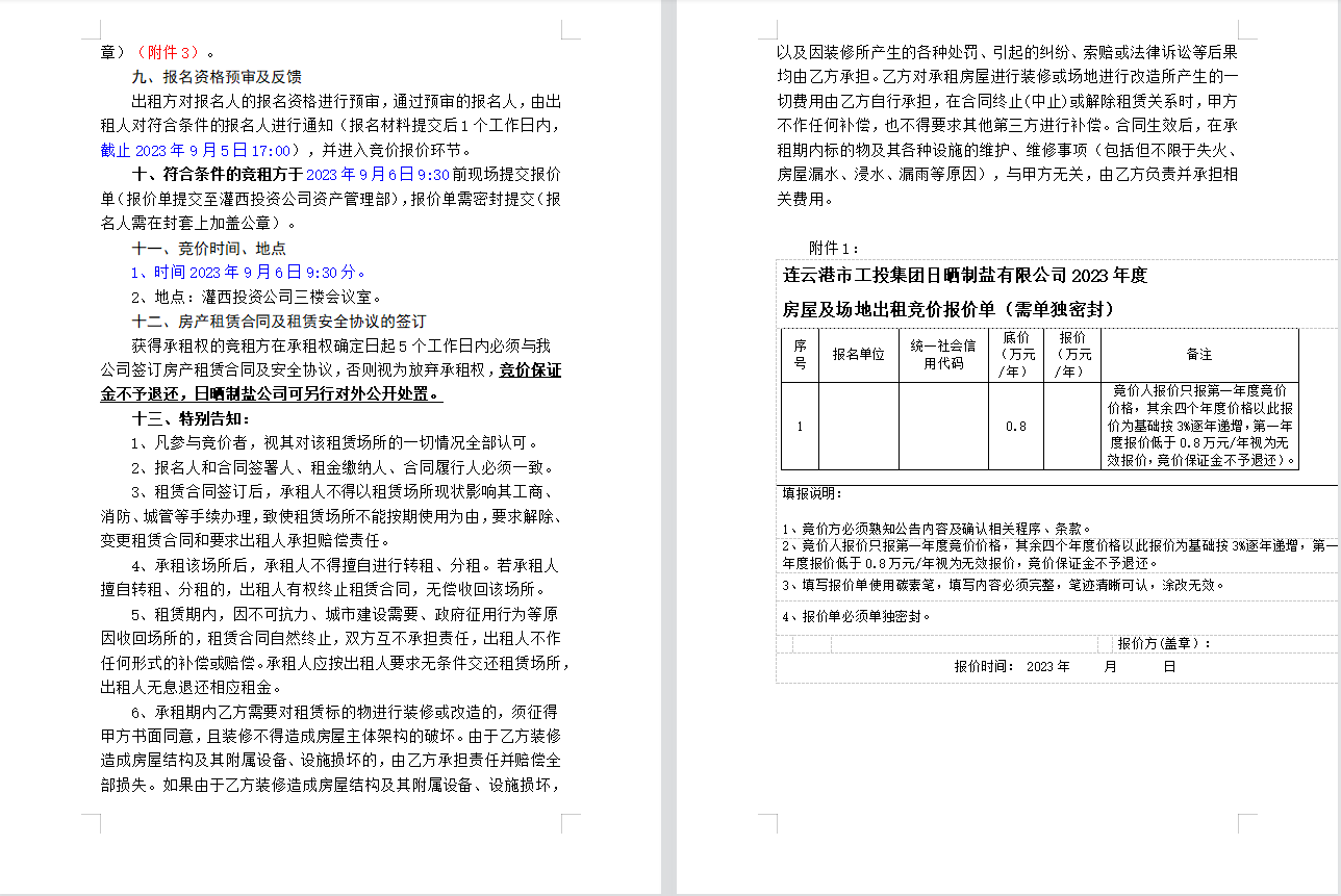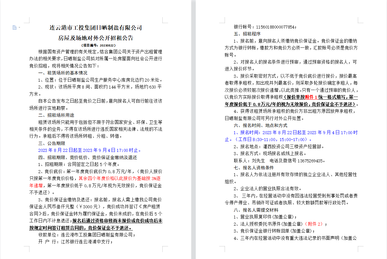 连云港市工投华体会(中国)日晒制盐有限公司 房屋及场地对外公开招租公告