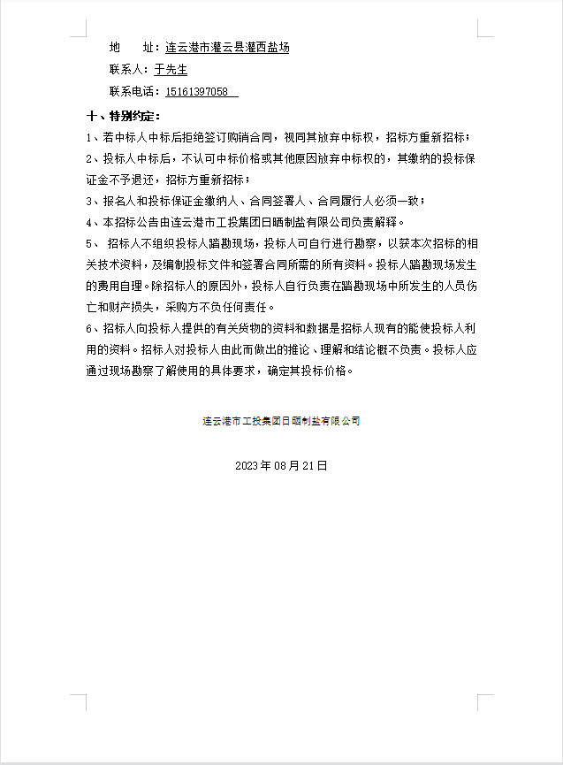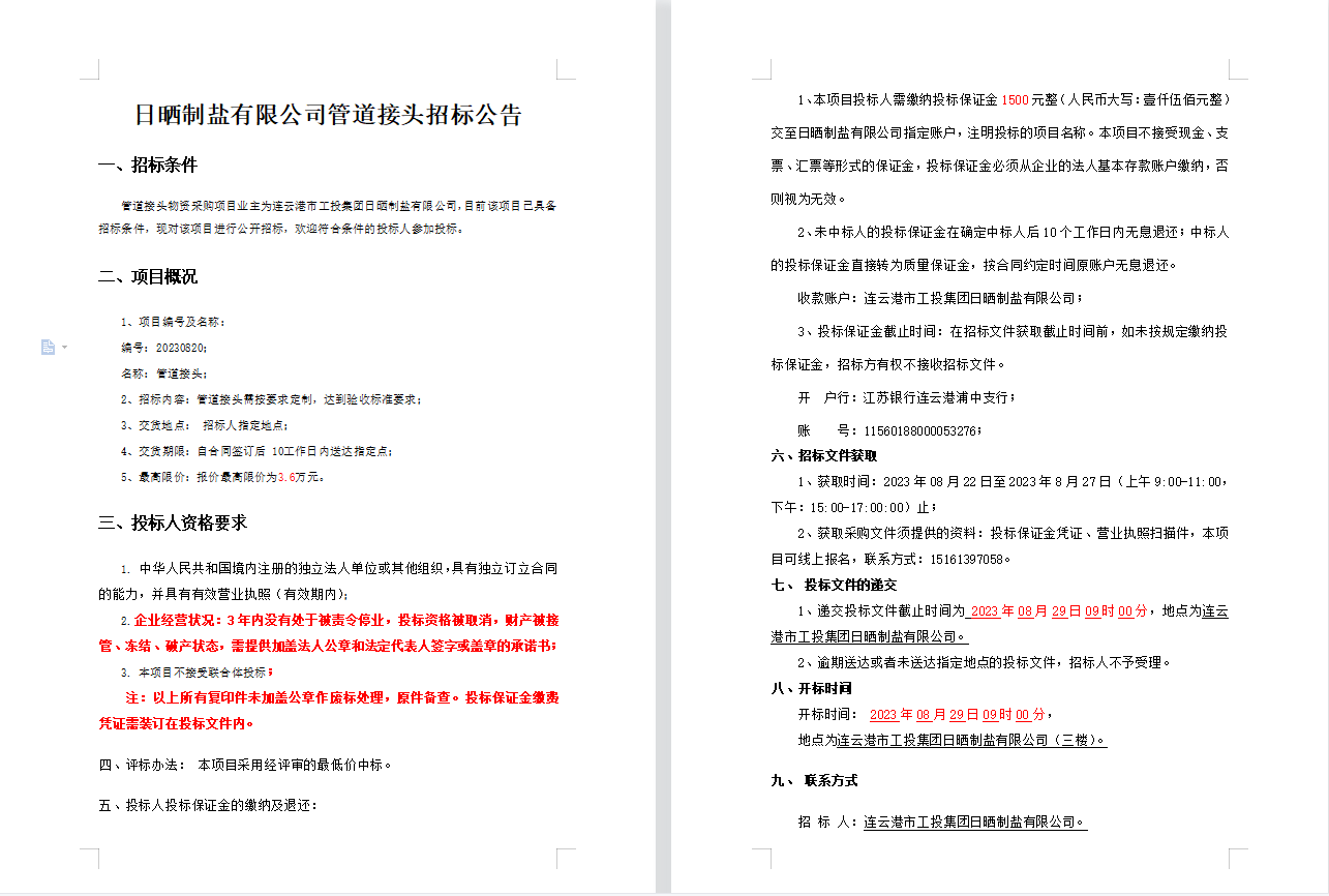 日晒制盐有限公司管道接头招标公告