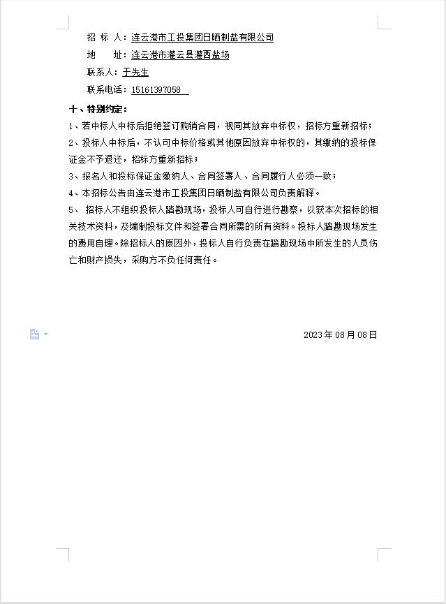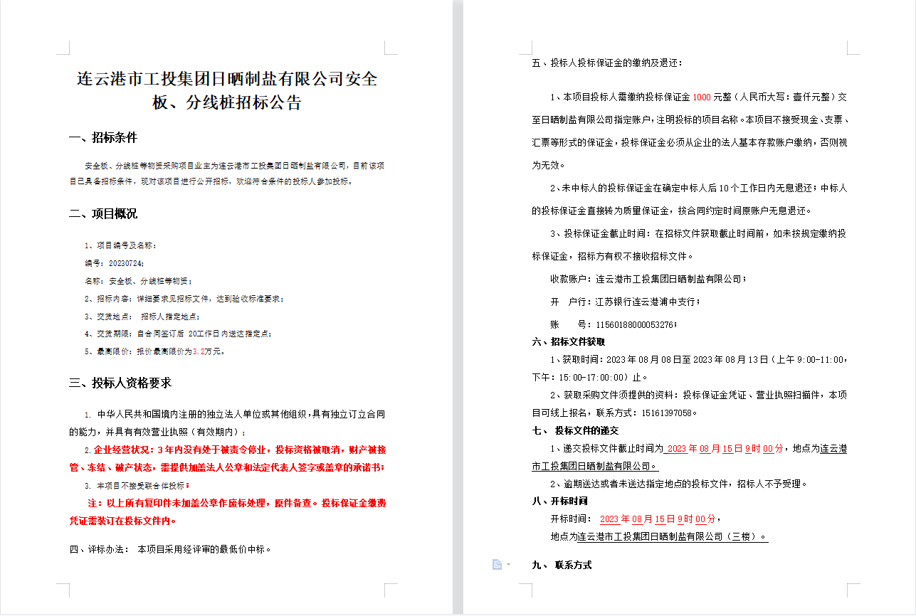 连云港市工投华体会(中国)日晒制盐有限公司安全板、分线桩招标公告