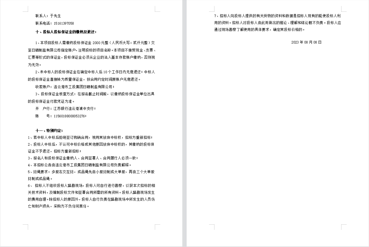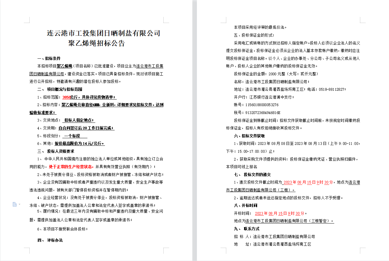 连云港市工投华体会(中国)日晒制盐有限公司聚乙烯绳招标公告