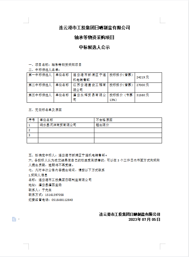 连云港市工投华体会(中国)日晒制盐有限公司轴承等物资采购项目中标候选人公示